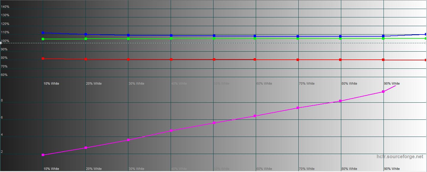 Колориметр показал, что запас яркости даже чуть больше заявленного: 317.007 кд/м2, но и минимальная яркость высоковата: 0.549 кд/м2, как результат - не лучшая контрастность 577:1. Цветовые составляющие близки к эталонным значениям, а погрешность О”E колеблется от 0 до 8, что очень неплохо для этого класса ноутбуков. Цветовой же охват ощутимо меньше sRGB, что видно на CIE-диаграмме. Из-за этого и возникает ощущение недостаточной полноты и насыщенности картинки: