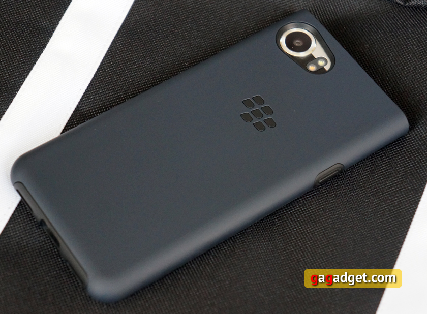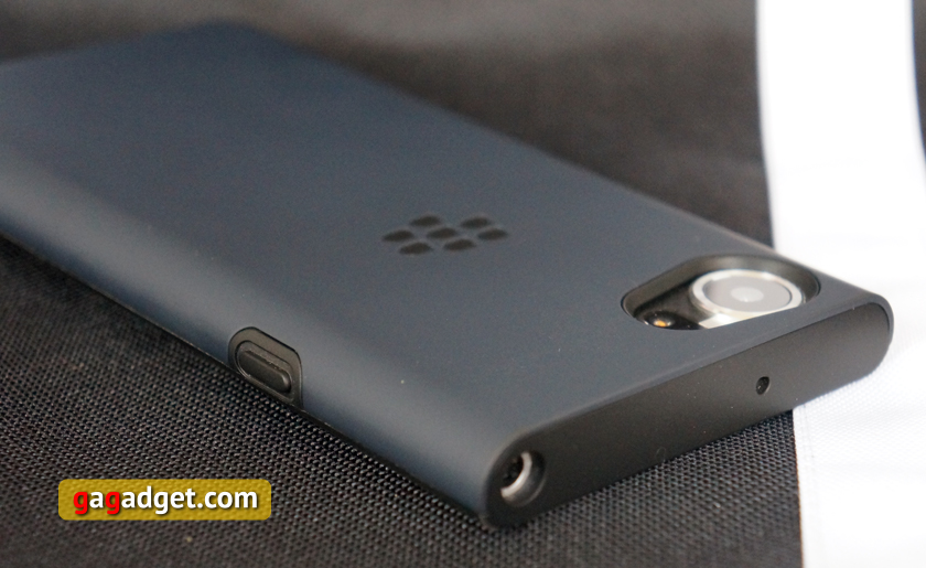 Задняя панель смартфона практически полностью сделана из текстурированного пластика с софт-тач-покрытием. Он очень приятен тактильно и не особо собирает отпечатки. Посередине - серебристый логотип BlackBerry, в верхней части - металлическая вставка и модуль основной камеры: