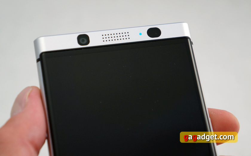 Область над экраном напоминает таковую в BlackBerry Passport Silver Edition. Она сделана из металла, на ней размещены сетка разговорного динамика, фронтальная камера, светодиодный индикатор и набор датчиков:
