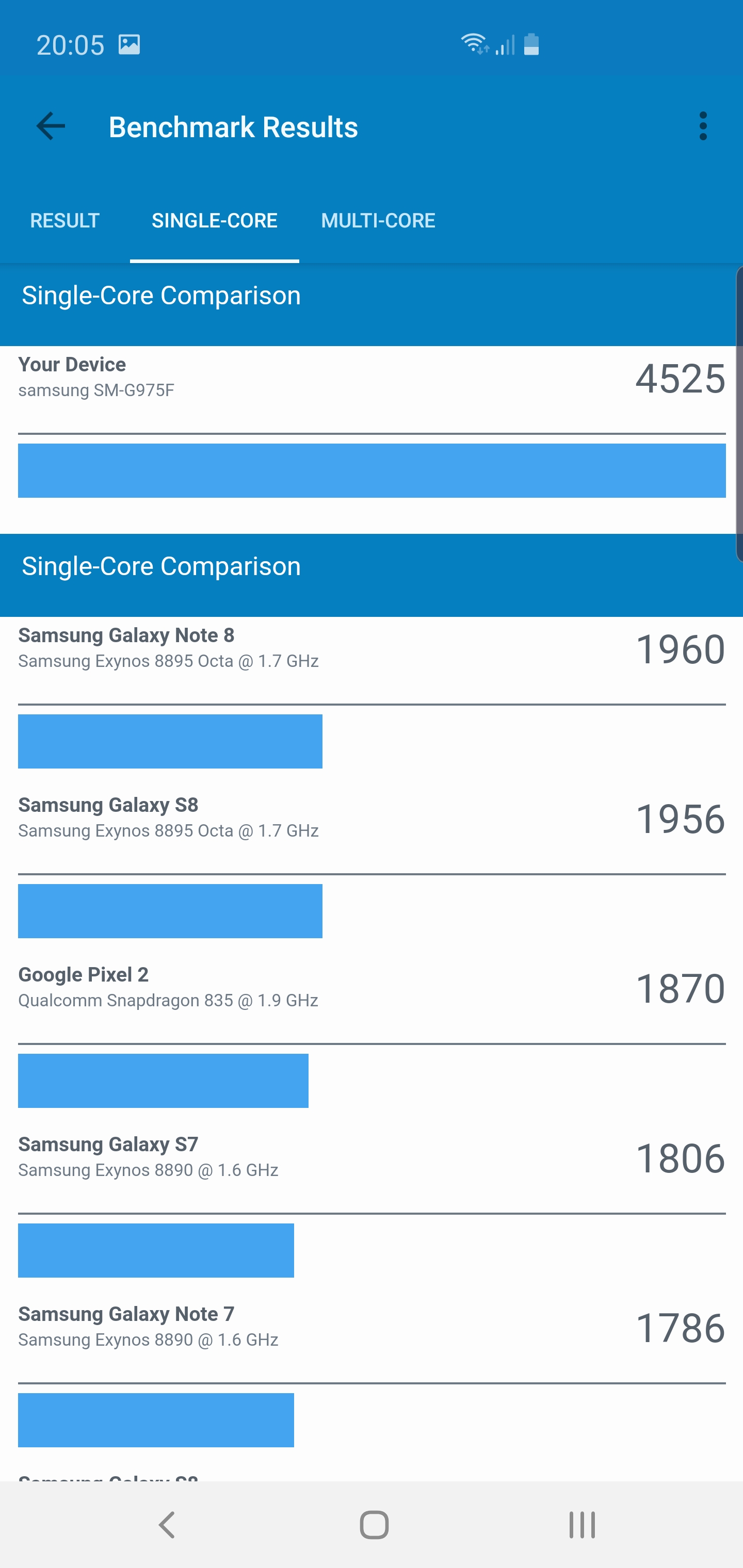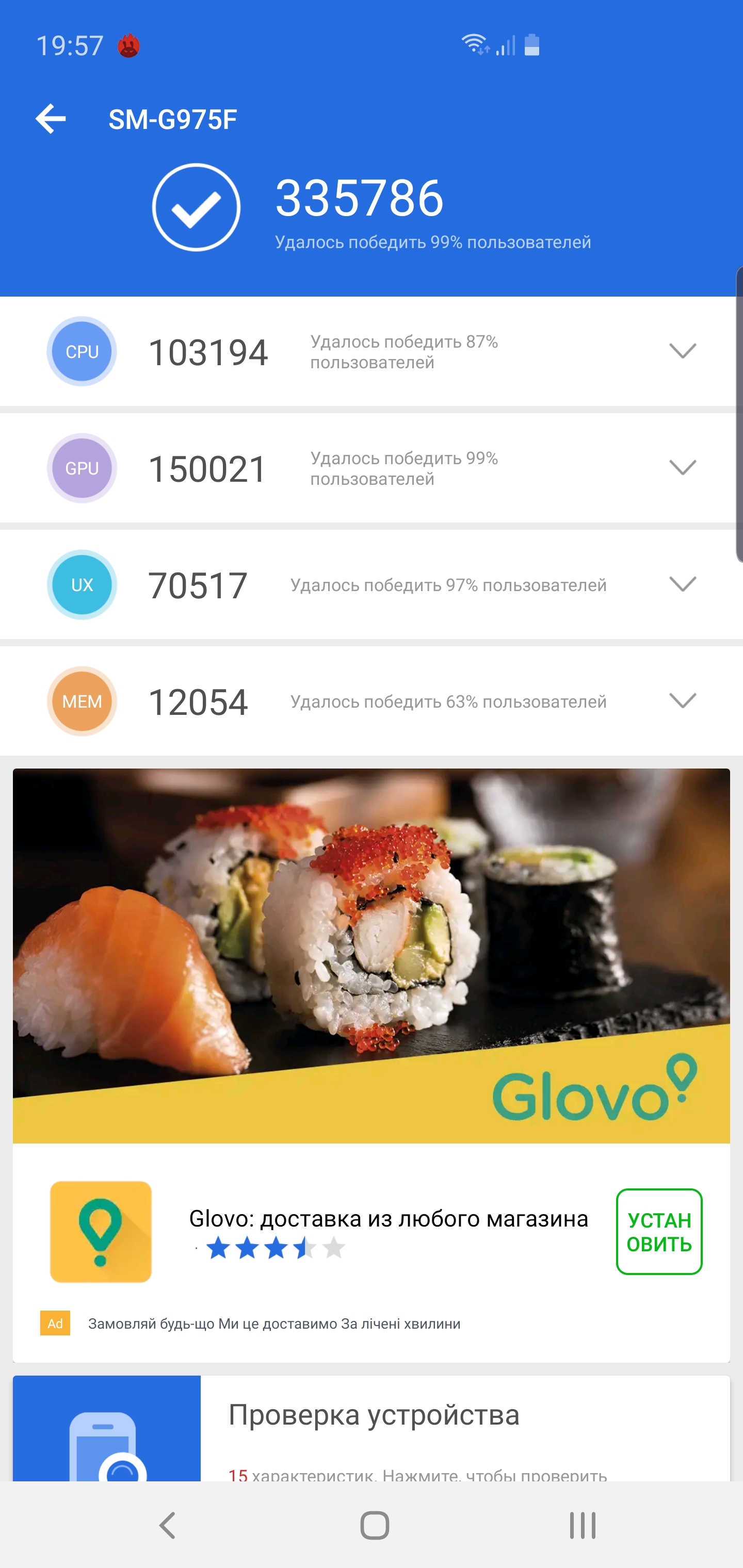В бенчмарках смартфон демонстрирует очень высокие результаты. Со Snapdragon 855 пока сравнить не получится: в наших руках пока не побывал ни один смартфон с ним. Можно предположить, что решение Qualcomm будет выбивать чуть больше "попугаев", в частности благодаря более производительной графике. Конкурента же в лице Kirin 980 решение Samsung опережает. AnTuTu выпустила отдельный новый тест AiTuTu для NPU-модулей. Ниже также есть результаты в этом тесте, но сравнения с другими моделями в пока AiTuTu нет:
